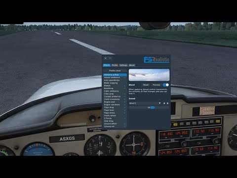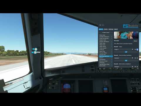 First Person / Avatar mode, Turbulence, Touchdown main, Touchdown front, Engine vibrations, Propwash, Low altitude turbulence, Stall buffet, Reverse thrust, Ground roll, Breathing, Speed brake drag, Gear drag, Auto speed brake, Blade slapping, Brakes, Engine start, Ground effect, Stick shaker, Floats splash, Airframe wind, Windshield wind, Wind ambiance, Cockpit ambiance, Overspeed, Over G, Wheel well, Flaps lever, Flaps stress, Flaps drag, Landing claps, Crash screaming, Sneezing, Toilet flush.